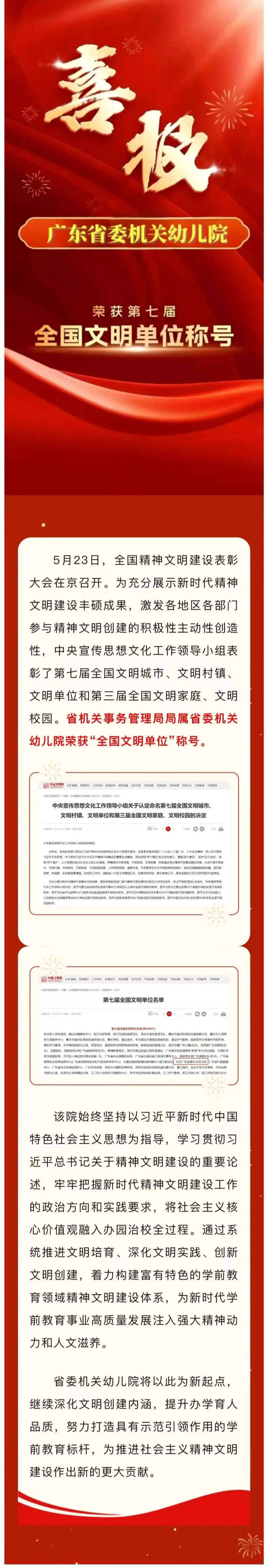 祝贺 | 广东省委机关幼儿院荣获“全国文明单位”称号