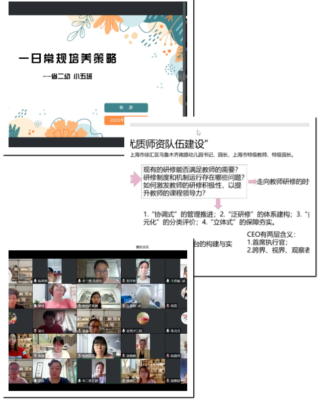 在有序开展各项疫情防控工作的同时,育才二院的老师们停课不停学,停课不停研,多次组织线上研学会议,从理论到实践,进行了多方位的教研学习。各位老师认真学习“幼儿园课程建构、学前儿童STEM教育、研修班学习分享”等专题讲座。同时,该院老师还就社会热点问题“家长冲突事件”“女童滑梯意外事件”进行讨论,借此加强教师师风师德建设,提升日常处理问题的能力。通过线上教研活动,教师们交流碰撞,夯实了专业知识,提升了教研能力,有力的推动教学实践工作行稳致远。